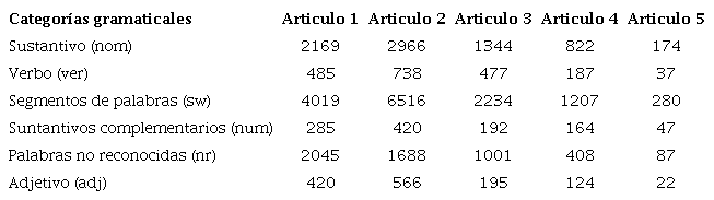 Las categorías gramaticales con el mayor porcentaje son los segmentos de palabras con 46% que son considerados los sonidos individuales que conforman una palabra, sustantivos (24%) se usan para nombrar a sujetos u objetos y palabras no reconocidas en el diccionario (17%). Mientras que algunas otras categorías gramaticales como verbo (6%) que expresa acción, proceso, estado o existencia que afecta al sujeto, sustantivo complementario (4%) que se refiere a aspectos que complementan al sustantivo y adjetivo (4%) que se usa para calificar al sustantivo, es decir, indica cualidad. También los artículos científicos con la mayor extensión son el artículo 2 con 12.894 palabras y el artículo 1 con 9.423 palabras, mientras que el artículo 3 tiene 5.443 palabras, el artículo 4 tiene 2.912 palabras y el artículo 5 tiene apenas 647 palabras (Tabla 2).