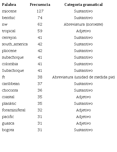 Las palabras no reconocidas en el diccionario son palabras que están en el corpus, pero no están incluidas en el diccionario en idioma inglés que tiene el software con el cual ejecuta el análisis del corpus. En general las formas no reconocidas en el caso del corpus de fósiles colombianos son palabras técnicas utilizadas en paleontología (e.g. intervalos de tiempo geológico, nombres y hábitos de vida de los organismos, localidades donde se encuentran los fósiles, palabras compuestas (normalmente unidas con un guion), abreviaturas de medidas o geográficas. Las formas no reconocidas con una frecuencia mayor a 30 se listan en la Tabla 3.