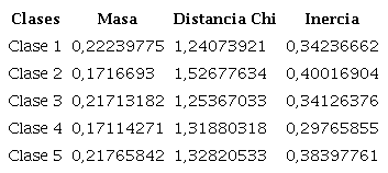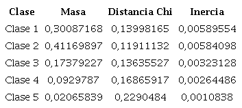 Las clases que tiene el mayor peso son la clase 1, la clase 2 y la clase 5, es decir, que son las clases más importantes en este análisis. La clase 1, la clase 3 y la clase 4 son las clases que tienen la menor distancia. La clase 1, la clase 2 y la clase 5 son los que tienen los mayores valores de inercia (Tabla 6).