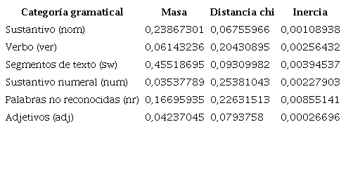 La Tabla 5 muestra las medidas de masa, Chi-cuadrado e inercia que usó el análisis factorial de correspondencias de las categorías gramaticales.