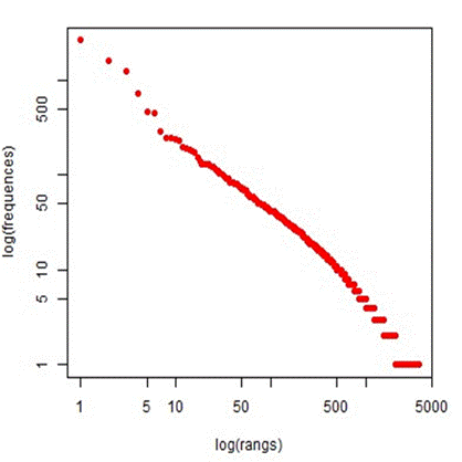 El diagrama de Zipf presenta el comportamiento de las frecuencias de palabras en el corpus textual mostrando que las palabras que tienen una frecuencia mayor a 500 son: the (frecuencia 2641), of (frecuencia 1593), and (frecuencia 1258) e in (frecuencia 729) (Figura 1). Adicionalmente, se encontraron 33.507 ocurrencias, 3.768 formas lematizadas y 1.580 hápax lematizadas o palabras que aparecen una única vez (4.72% de ocurrencias y 41.93% de formas) y una media de ocurrencia por texto de 6.701 palabras (es el resultado de la división entre el número de ocurrencias /número de textos). La frecuencia de aparición de las palabras oscila entre 2.641 y una ocurrencia.