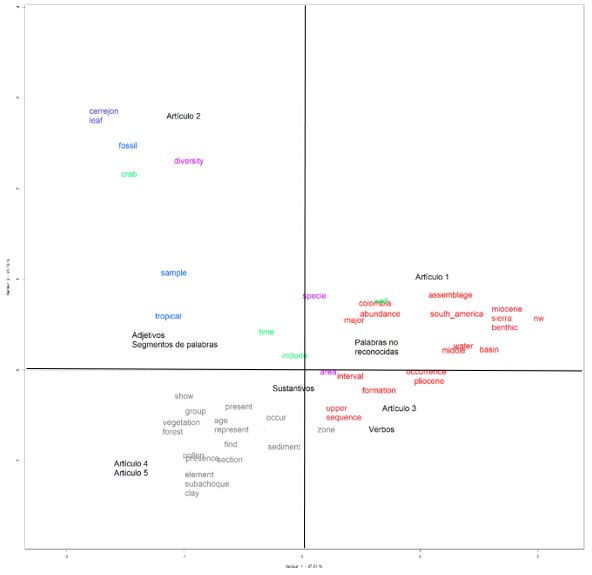 En cuanto a la asociación entre artículos y categorías gramáticas, el análisis factorial de correspondencias muestra que el artículo 1 se asocia con palabras no reconocidas en el diccionario, el artículo 2 con adjetivos y segmentos de palabras y finalmente el artículo con verbos. Por otro lado, los artículos 4 y 5, el artículo 4 y el artículo 5 se asocian con sustantivos y sustantivos numerales. Adicionalmente, este análisis, también muestra que hay dispersión entre las palabras de los cinco artículos, solamente se encontró proximidad léxica entre el artículo 2 y el artículo 3 (Figura 2). En general, entre los cinco artículos no se encontró proximidad léxica o “mundos lexicales” comunes, a pesar de que tienen un tema en común que son los fósiles colombianos, estos artículos investigan sobre este tema desde diferentes subtemas o intereses de los investigadores.