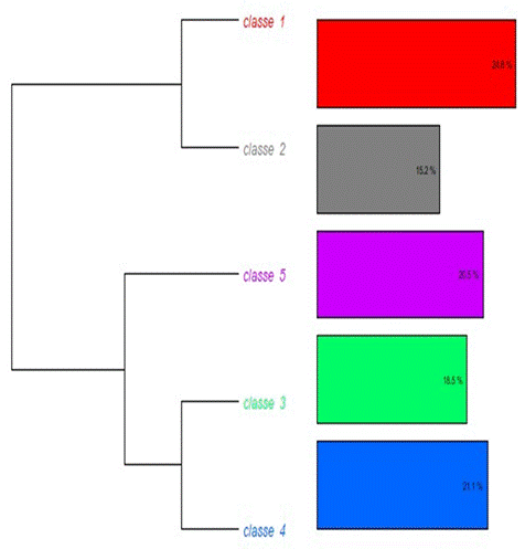 La clasificación jerárquica descendiente (CJD) sigue el método propuesto por Reinert (1983). La CJD clasificó las palabras en grupos y generó el dendograma de clase. Este dendograma muestra las clases lexicales, cada clase representa una temática y el vocabulario que las define. Cada clase está representada por un color diferente, y las unidades de contexto elemental (palabras) tienen el mismo color que la clase (Figura 3). El corpus está compuesto por cinco textos, 870 segmentos de texto, 4.233 formas, 31.319 ocurrencias, 3.620 lemas, 1.450 formas activas, 303 formas suplementarias, 1.144 formas activas con una frecuencia >=3:700, media de formas por segmento es de 35.998851, número de clases 5 y 658 segmentos clasificados en 870 (75.63%).