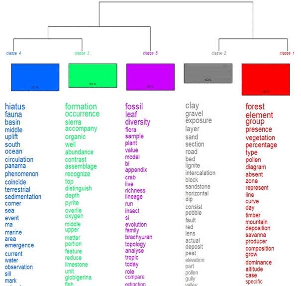 Según Reinert (1995), la CJD discrimina los “mundos lexicales” y muestra los vínculos entre formas específicas y las clases o agrupamientos de palabras que tienen relaciones entre cada clase, o bien, entre las palabras de una misma clase. Por ejemplo, en la clase 1, las formas “forest”, “vegetation” y “pollen” representan un “mundo lexical” relacionado con los fósiles vegetales. En la clase 2 las formas “sandstone”, “clay”, “sand” y “graval” representan un “mundo lexical” relacionado con las rocas. En la clase 3 las formas “limestones” y “pyrite” representan los mundos lexicales relacionados con minerales y rocas. En la clase 4 las formas “ocean”, “water”, “sea” y “marine” representan un “mundo lexical” relacionado con fósiles marinos. En la clase 5 las formas “insect” y “crab”, así como “flora”, “leaf” y “plant” representan los “mundos lexicales” relacionados con flora y fauna. Llama la atención las relaciones entre la clase 2 y en la clase 1 con la forma “pollen” que es común en ambas clases, lo que significa que el “mundo lexical” de esas dos clases está relacionado con la fauna fósil. En las clases 3, 4 y 5 no se encontraron formas comunes relacionadas entre las tres clases, pero si palabras relacionadas temáticamente que representan “mundos lexicales” comunes; por ejemplo, “fauna”, “flora”, “globigerina”, etc.