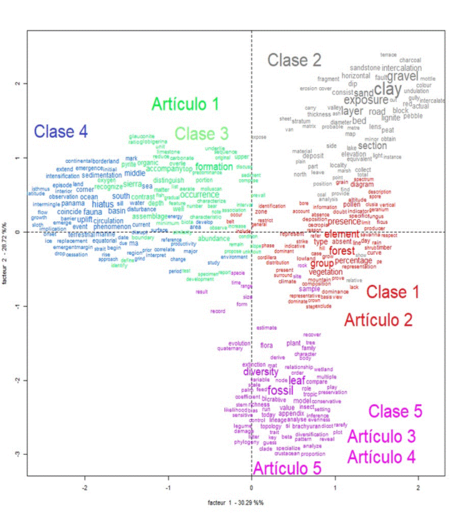 Este AFC muestra las proximidades de los “mundos lexicales” que representan cada clase. En la clase 1 sobresalen las formas activas de “forest”, “element” y “group”. En la clase 2 sobre salen las formas activas “clay”, “gravel” y “exponsure”. En la clase 3 sobre salen las formas activas de “formation” y “occurrence”. En la clase 4 sobresalen las formas activas de “hiatus”, “fauna” y “basin”. En la clase 5 sobre salen las formas activas de “diversity”, “leaf” y “fossil”. En otras palabras, en la Figura 5 se observan las relaciones temáticas que existen entre cada clase y que fueron descritas en el análisis de la Figura 4. Si bien es cierto la Figura 5 muestra dispersión entre el total de las cinco clases, también muestra las proximidades entre clases y artículos; por ejemplo, la clase cinco se asocia con el artículo 3, artículo 4 y artículo 5 que muestran proximidad entre los “mundos lexicales” de los autores de estos artículos que fueron publicados entre 2006 a 2019. La clase 3 con el artículo 1 y la clase 1 con el artículo 2.