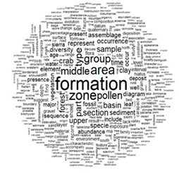 Finalmente, la nube de palabras (Figura 6) facilita la visualización de los términos más utilizados en el corpus. Se excluyeron los términos de las clases gramaticales: adverbios, artículos, conjunciones, onomatopeyas y preposiciones. Se seleccionaron las formas activas que corresponden a sustantivos y verbos que se muestran en esta Figura. Las formas activas que se usaron son 1271 palabras con una variación en la frecuencia entre 3 a 290. Las palabras que aparecen con mayor tamaño y que se ubican en el centro de la Figura y son las que tienen la mayor frecuencia; por ejemplo, “formation”, “pollen”, “America”, “miocene”, etc. Mientras que las palabras con menor tamaño tienen menores frecuencias.