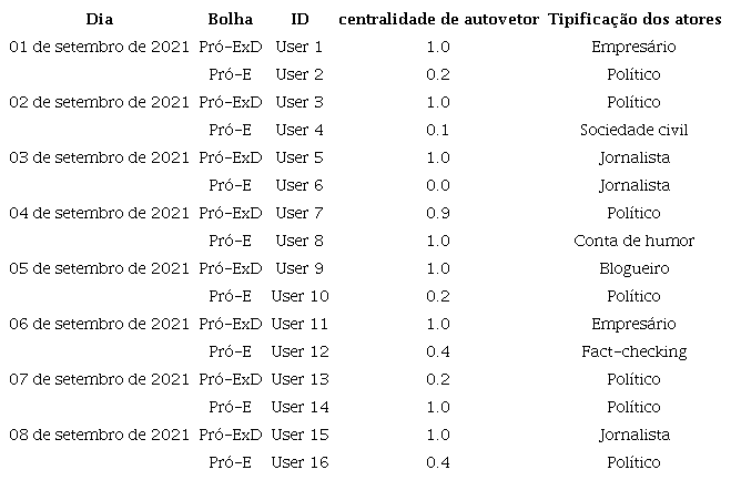 Tipicamente, esses atores contam com número elevado de seguidores, constituindose de peças-chave para a propagação de informações. A bolha pró-extrema direita preocupa pelas características de seus influenciadores, sendo amplamente conhecidos na mídia por incentivar atos contra instituições democráticas no país (usuários 1, 7, 9, e 15), e disseminar deliberadamente desinformação em massa (usuários 1, 7, 11, 9 e 15), incluindo ator com mandado de prisão expedido por esse motivo e por atacar deliberadamente membros do Supremo Tribunal Federal (usuário 9). Também se observa que os discursos desses players têm se capilarizado em outros meios e plataformas, como colunas de jornais, canais do Youtube e anúncios de cursos baseados em ideologias de extrema direita.
