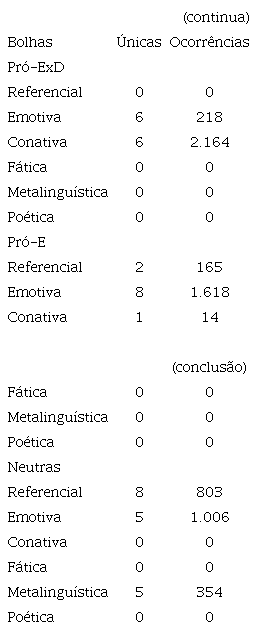 Nessa mesma bolha, também foi identificada a prevalência da função conativa (n = 2.164), seguida da função emotiva (n = 218). Os achados quanto ao uso majoritário da função conativa são similares aos de Recuero et al. (2015) ao analisarem as funções das hashtags durante o período de protestos no Brasil em 2013. Para os autores, o uso dessa função tem um papel similar a de um panfleto, com a função de motivar, influenciar e mobilizar. Já nas bolhas pró-esquerda e neutra, cujas hashtags são mais dispersas e reativas, observou-se a prevalência da função emotiva, que se baseia na intenção de compartilhar opiniões, pensamentos e sentimentos.