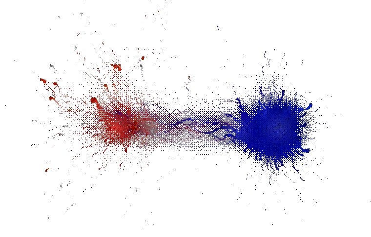 Dos 40.000 tweets que compuseram o conjunto de dados (Tabela 1) da pesquisa, 5.830 (14,6%) foram tweets originais e 34.170 (85,4%) foram retweets (republicação de um tweet). O grafo da Figura 1, que compõe a rede completa dos oito dias analisados, possui um baixo coeficiente de agrupamento (0.001), característica própria das relações antagônicas entre as duas principais bolhas. A rede inteira possui 2.696 componentes fracamente e 25.176 fortemente conectados e grau médio de 1.596.