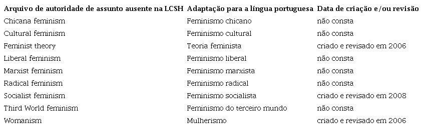 Vale destacar ainda que alguns desses termos considerados omissos na LCSH estão presentes no “Tesauro para estudos de gênero e sobre mulheres”, tendo sido publicado pela Fundação Carlos Chagas e editora 34, em 1998, tais como: feminismo liberal, feminismo marxista e feminismo radical (BRUSCHINI; ARDAILLON; UNBEHAUM, 1998).