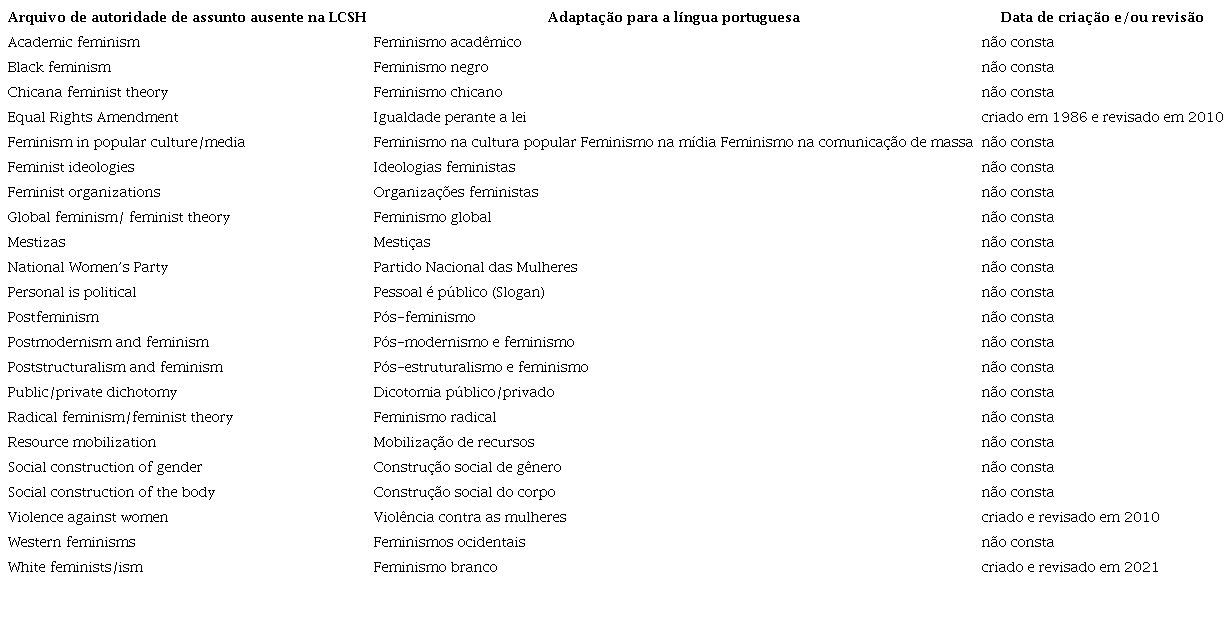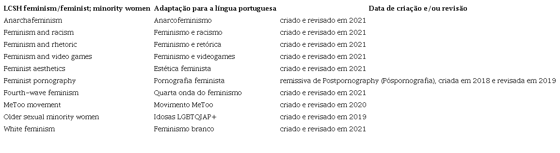 Para tanto, definiu-se pelo recorte temporal de termos criados entre 2011 e 2021 como complemento ao estudo sobre mulheres e feminismos na LCSH, conforme apresentados na seção 6.1 por Berman (1971), Olson (2000) e Wood (2010).
