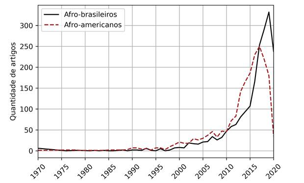 Os registros recuperados compõem um corpus de 4 mil artigos, sendo 2 mil sobre afro-brasileiros e os outros 2 mil sobre afro-americanos. As publicações compreendem o período entre 1970 e 2020. No Gráfico 1, apresenta-se o crescimento da discussão sobre a temática na literatura ao longo do período delimitado.