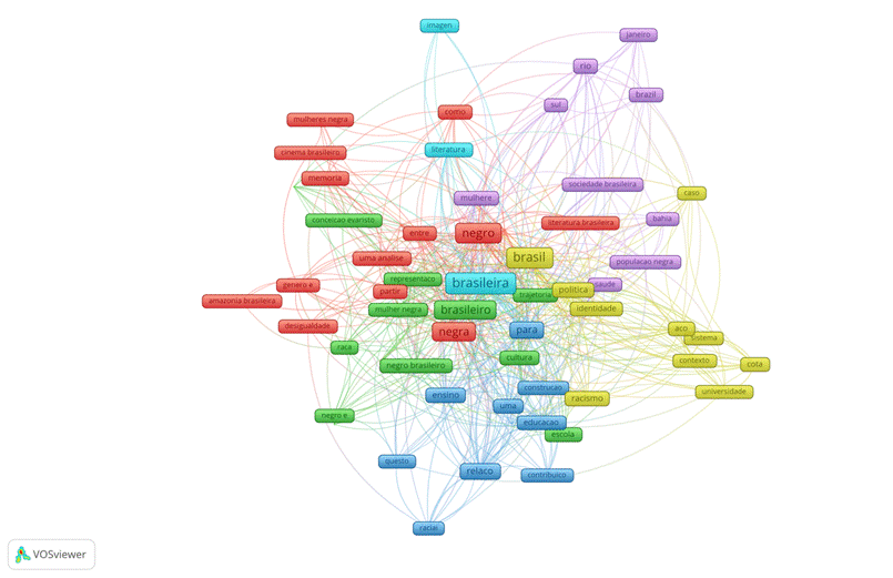 A partir de uma análise de co-ocorrência de termos baseada nos títulos dos artigos, criou-se um mapa para identificar possíveis temáticas mais frequentes nas pesquisas sobre afrodescendentes. Na Figura 2, são apresentados seis clusters que indicam as temáticas abordadas nos trabalhos sobre afro-brasileiros e analisaremos as cinco principais.