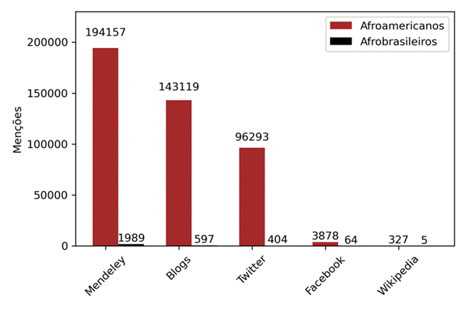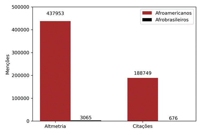 Results: The publications cover the period between 1970 and 2020. On Afro-Brazilians, were identified discussions about topics related to teaching, education, quotas in universities and representation of black women in literature. As for African-Americans, the themes revolve around the health of the black population and racial disparities with other ethnic groups. The online attention of the articles was measured by altmetric data and citations, there was a great contrast between publications about the two populations.