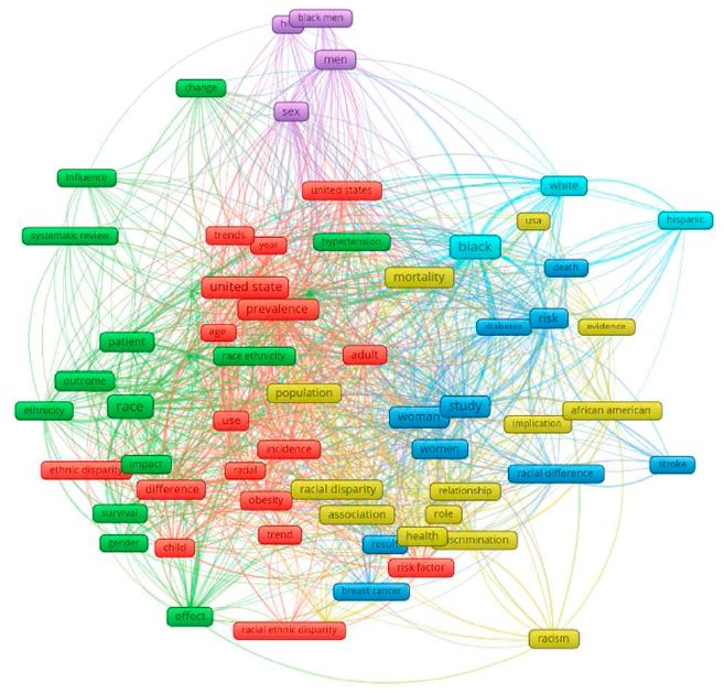 O cluster verde, por exemplo, agrupa pesquisas que discutem a etnicidade e gênero a partir de doenças como hipertensão e o seus efeitos e impactos em pacientes negros. As pesquisas localizadas no cluster vermelho, por sua vez, abordam o tratamento de doenças, como a obesidade, e a incidência delas em crianças e adultos negros.