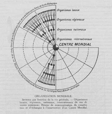 O foco, pois, da proposta otletiana, está na configuração política da seara bibliográfica. Trata-se de um programa diplomático entre nações, sustentado pelos conceitos de mundialismo, universalismo e internacionalismo. A Rede Mundial de Informação e de Documentação de Otlet (1934), presente na folha de rosto de seu Traité, não é nada mais - não só no sentido aplicado, como também no sentido teórico - que o exercício bibliográfico em sua movimentação.
