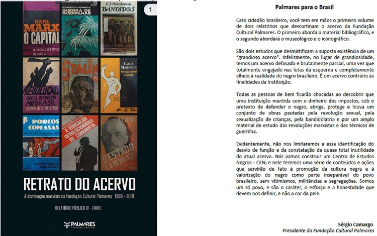 Por fim, em julho de 2021, a Fundação Cultural Palmares, instituição que visa preservar e promover a afro-brasilidade, elaborou e publicou o relatório “Retrato do acervo: três décadas de dominação marxista na Fundação Palmares”, no qual o presidente da Fundação, indicava que