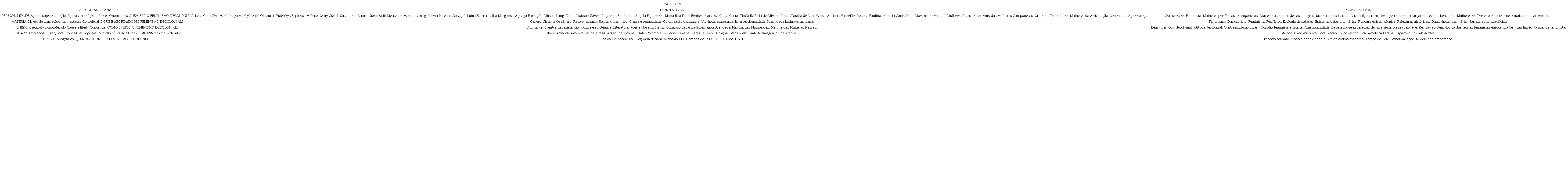 Para a elaboração do Quadro 01, a seguir, utilizou-se o mesmo percurso de raciocínio empregado por Costa (2008), no qual o foco está no agrupamento da diversidade terminológica correspondente a cada categoria. Para a seleção desta diversidade terminológica, foi realizada a análise de conteúdo na obra “Pensamento feminista hoje: perspectivas decoloniais”, com textos de notórias pensadoras e artistas feministas, organizados por Heloísa Buarque de Holanda (2020), sendo elas: Lélia González, María Lugones, Oyèrónké Oiewùmí, Yuderkys Espinosa Miñoso, Ochy Curiel, Susana de Castro, Suely Aldir Messeder, Marnia Lazreg, Julieta Paredes Carvajal, Luiza Bairros, Alba Margarita, Agnaga Barragán, Miriam Lang, Dunia Mokrani Xávez, Alejandra Santillana, Angela Figueiredo, María Eira Díaz-Benítez, Maria da Graça Costa, Thula Rafaela de Oliveira Pires, Claudia de Lima Costa, Adriana Vaarejão, Rosana Paulino e Marcela Cantuária.