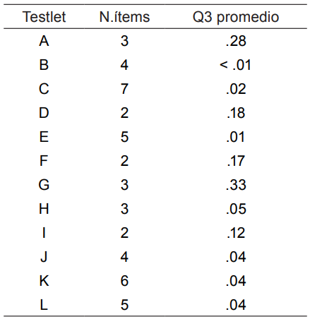 El testlet con mayor dependencia local fue el G (.33), seguido por el A (.28). El resto de testlets muestra un Q3 promedio inferior a .20. Esto podría explicar la poca diferencia entre la estimación de la confiabilidad entre ambos métodos, pues el modelo de testlets en general trata de captar la dependencia entre los ítems y, al ser poca, no habría mucha diferencia entre ambas estimaciones, como ocurre en el presente caso. En ese sentido, si la confiabilidad basada en la consistencia interna es calculada a nivel de ítem, los dos niveles de correlación (dentro del testlet y entre testlets) son promediados, y el resultado generalmente es un valor mayor que la correlación promedio, que sería obtenida entre ítems que no muestran esos dos niveles de correlación (Sireci, Thissen y Wainer, 1991). Por lo tanto, es importante cuantificar la cantidad de dependencia local que se encuentra entre un conjunto de ítems.