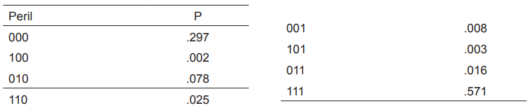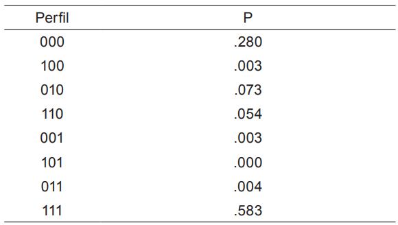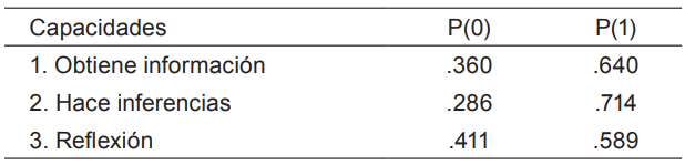 En general, se puede observar, en la tabla 6, que todas las capacidades evaluadas en esta muestra tienen una probabilidad mayor a .50 de ser dominadas. Además, los perfiles de capacidades más usuales son aquellos en el que se dominan todas las competencias o aquel en el cual no se domina ninguna de ellas, tal y como aparece en la tabla 7.
