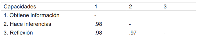 A continuación, la tabla 8 presenta las correlaciones entre las capacidades estimadas con el modelo G-DINA, las cuales son bastante altas y similares entre sí.