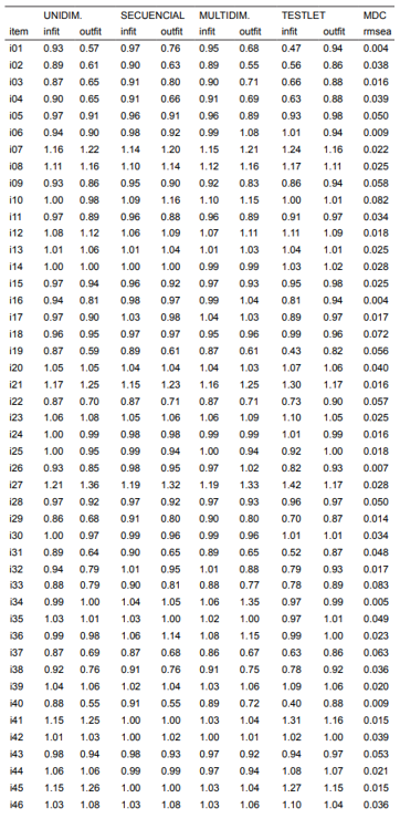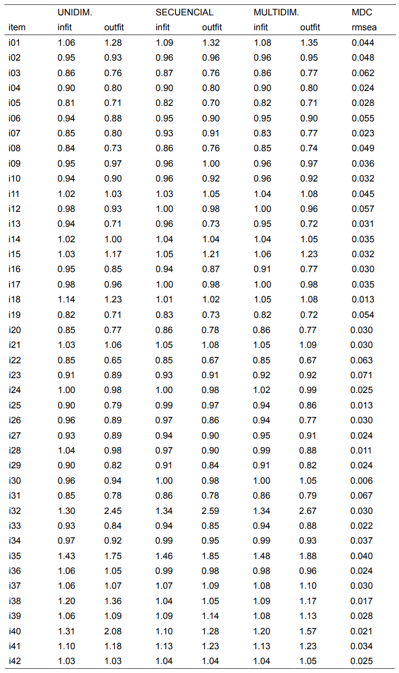 La Tabla 9 contiene los indicadores de ajuste de los ítems a los diferentes modelos considerados como parte de esta investigación.