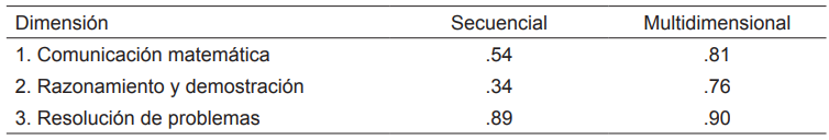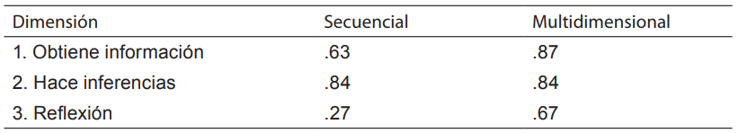 Es posible modelar de distintas maneras la multidimensionalidad que podría estar contenida en un instrumento de medición. En la tabla 1 se muestra la confiabilidad estimada para las distintas dimensiones consideradas en la prueba de lectura, al aplicar la estrategia secuencial, que implica modelar cada dimensión de forma independiente, y la del modelo multidimensional. En el caso del modelo secuencial, los coeficientes fluctúan entre .27 y .84; mientras que en el modelo multidimensional, entre .67 y .87.