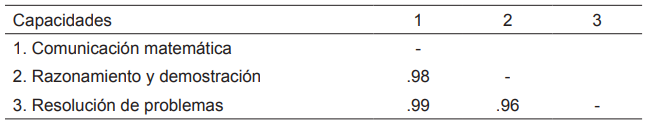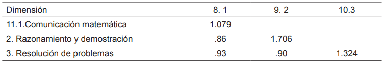 La tabla 11 presenta los coeficientes de correlación de Pearson entre las medidas que operacionalizan las tres dimensiones evaluadas mediante la prueba de matemáticas. Esas correlaciones fluctúan entre .86 y .93.
