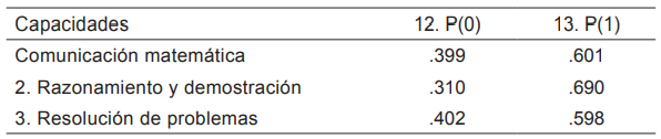 En el caso de la prueba de matemática, al momento de ajustar el modelo de diagnóstico cognitivo, también se decidió estructurar la matriz Q usando la misma estructura considerada al momento de aplicar el modelo Rasch multidimensional.En la tabla 12 se observa que todas las capacidades evaluadas en esta muestra tienen una probabilidad mayor a .50 de ser dominadas. Además, los perfiles de capacidades más usuales son aquellos en los que se dominan todas las competencias o aquel en el cual no se domina ninguna de ellas, tal y como aparece en la tabla 13.