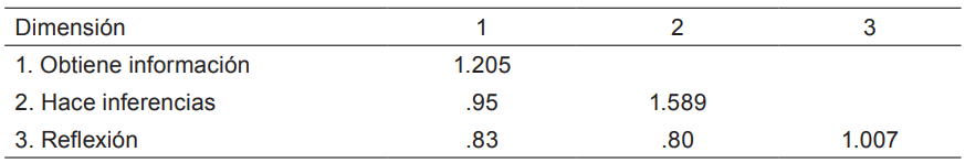 De igual modo, en la tabla 2 se pueden apreciar los coeficientes de correlación de Pearson entre las medidas derivadas de aplicar los ítems que conforman cada una de las dimensiones de la prueba de lectura. Esas correlaciones varían entre .80 y .95.