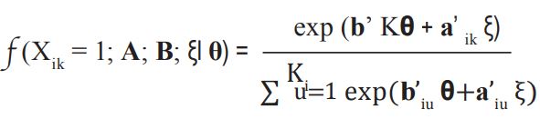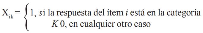 Además se suponen I ítems, indexados como i = 1, ..., I, cada uno con K1+1 alternativas de respuesta, indexadas como K = 0,1,...,Ki. Una respuesta en la categoría K, de la dimensión d, en un ítem i, es calificada como bikd. Las puntuaciones en las Ddimensiones se recogen en un vector columna, bik = (bik1,..., bikD)’, y luego pueden conformar la submatriz del ítem i, Bi = (bi1,...,biD)’, las cuales finalmente se integran en la matriz de puntuaciones B = (B’1,...,B’I)’.