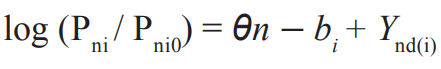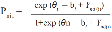 donde Pni1 y Pni0 son las probabilidades de puntuar 1 y 0 en el ítem i para la persona n, respectivamente. Si Ynd(1)=0 (sin efectos testlet), la ecuación se reduce al modelo Rasch para ítems dicotómicos. Además, dicha ecuación puede ser extendida a ítems politómicos y expresada como: