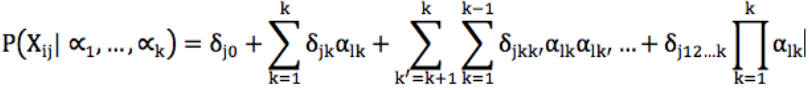 Con P(Xij | ∝1,…,∝k ) se presenta Con Con P(X_ij |∝_1,…,∝_k ) se presenta la probabilidad de responder correctamente un ítem, dadas k habilidades cognitivas (∝). El parámetro δj0 representa la dificultad general de un ítem; ∑k= δjk αlk, los efectos principales de las habilidades cognitivas consideradas en el modelo,y∑k’=k+1∑k=1δjkk’αlkαlk’…+δj12…k ∏k=1αlk resume los efectos de las interacciones entre dichas habilidades cognitivas.
