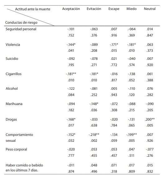 En la tabla 1 se muestran las correlaciones entre las actitudes ante la muerte (aceptación, evitación, escape, miedo, neutral) y las conductas de riesgo (seguridad personal, violencia, suicidio, fumar cigarrillos, beber alcohol, consumo de marihuana, de drogas, comportamiento sexual, peso corporal y haber comido o bebido en los últimos 7 días). En este, un asterisco (*) significa que existe una correlación débil; y dos asteriscos (**), una correlación fuerte.