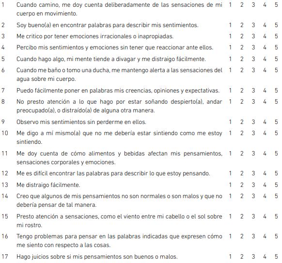 El instrumento principal de esta investigación fue la versión traducida al español del Cuestionario de las Cinco Faceta de Mindfulness (Five Facet Mindfulness Questionnaire [FFMQ]) (Baer et al., 2006), trabajada por Loret de Mola (2009). Consta de 39 ítems tipo Likert con un rango de respuesta del 1 al 5, siendo 1 es Nunca o muy rara vez cierto y 5 Muy a menudo o siempre cierto. Los ítems están organizados en cinco factores, los cuales se definen que la siguiente manera (Baer et al., 2006; Baer et al., 2008):