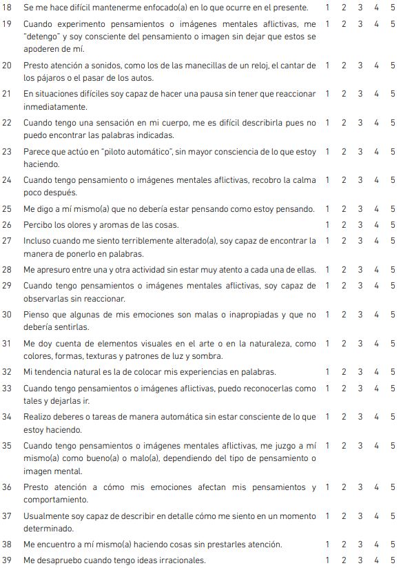 Tal y como se señaló en la sección de resultados, se eliminó el ítem 38 “Me encuentro a mí mismo(a) haciendo cosas sin prestarles atención”, por no contar con indicadores adecuados de ajuste al modelo. Es posible que esto ocurriera por una dificultad al entender el enunciado; particularmente se cree que fue complejo comprender el sentido de “Me encuentro a mí mismo(a)”, lo que dio como resultado un ítem poco claro. Tal vez una mejor redacción podría ser “Me doy cuenta de que hago cosas sin prestarles aten- ción”. Sin embargo, cualquier modificación debe ser probada empíricamente antes de poder incorporarla en una nueva versión del FFMQ.