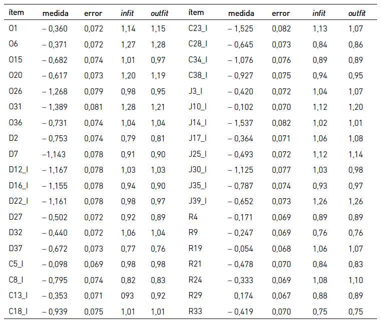 El ajuste de los ítems según el modelo psicométrico utilizado fue valorado mediante los índices infit y outfit, cuyos valores recomendables, en el caso politómico, fluctúan entre 0,6 y 1,4 (Wrigth y Linacre, 1996). Todos los ítems considerados, menos el 38, mostraron valores dentro de los parámetros aceptables (ver tabla 1), por lo cual este fue eliminado de los análisis. Además, todas las categorías de la escala de valoración han resultado ser valores modales, lo que produce umbrales Rasch-Andrich ordenados cuyos valores fueron: –1,654, –0,778, 0,433 y 2,009.