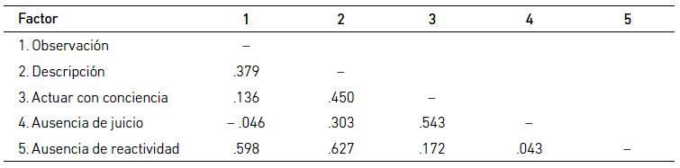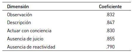 En cuanto a la confiabilidad de las puntuaciones, considerando el nivel de medición de los ítems que conforman el test, se utilizó el coeficiente alfa ordinal (Gadermann, Guhn y Zumbo, 2012). Los análisis realizados por Papi (2017) muestran que los coeficientes estimados para las puntuaciones obtenidas a partir de los ítems que corresponden a cada uno de los factores fueron adecuados: observación, .85; descripción, .88; actuar con conciencia, ausencia de juicio, .86; ausencia de reactividad ante experiencias internas, .75.
