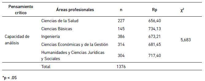 Con respecto al contraste análisis del área capacidad de análisis de la disposición hacia el pensamiento crítico entre los estudiantes de una universidad estatal de Lima Metropolitana considerando las diversas áreas profesionales, los resultados (tabla 5) indican que no se encuentran diferencias estadísticas significativas (χ2 = 5.68 p > .05).