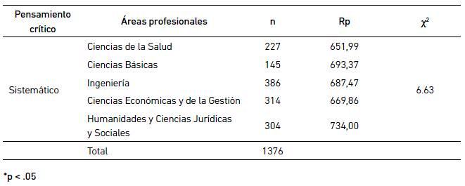Del mismo modo, con respecto al área sistemática de la disposición hacia el pensamiento crítico entre los estudiantes de una universidad estatal de Lima Metropolitana considerando las diversas áreas profesionales, se halló que no existe diferencia significativa (tabla 6). Este resultado concuerda con lo planteado por León (2014), quien confirma la existencia de ciertas disposiciones del pensamiento crítico como rasgos que caracterizan al pensador crítico, lo que es una condición propia del estudiante universitario. Del mismo modo, García et al. (2014) señalan que la práctica del buen pensamiento es esencial como expresión del área sistemática, condición presente e importante en un futuro profesional, por lo cual estaría justificada la inexistencia de diferencias según las áreas profesionales. Esto se debe a que el área sistemática, según Escurra y Delgado (2008a), constituye una característica tendiente a la disposición para la organización, al igual que para la concentración y el puntualizar ordenadamente una interrogante, sin escoger una forma determinada de organización.
