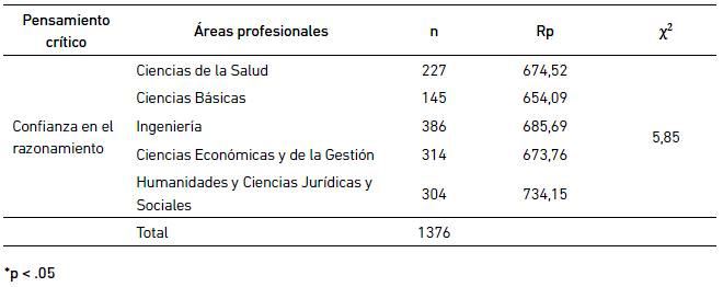 En cuanto a la comparación del área confianza en el razonamiento de la disposición hacia el pensamiento crítico entre los estudiantes de una universidad estatal de Lima Metropolitana considerando las diversas áreas profesionales, los resultados (tabla 7) indican que no existen diferencias estadísticas significativas (χ2 = 5.85 p > .05).