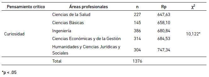 En lo que se refiere a la comparación en el área curiosidad de la disposición hacia el pensamiento crítico entre los participantes considerando las diversas áreas profesionales, los resultados en la tabla 8 muestran que sí existe una diferencia estadísticamente significativa, pues se obtiene un χ2 de 10,12.