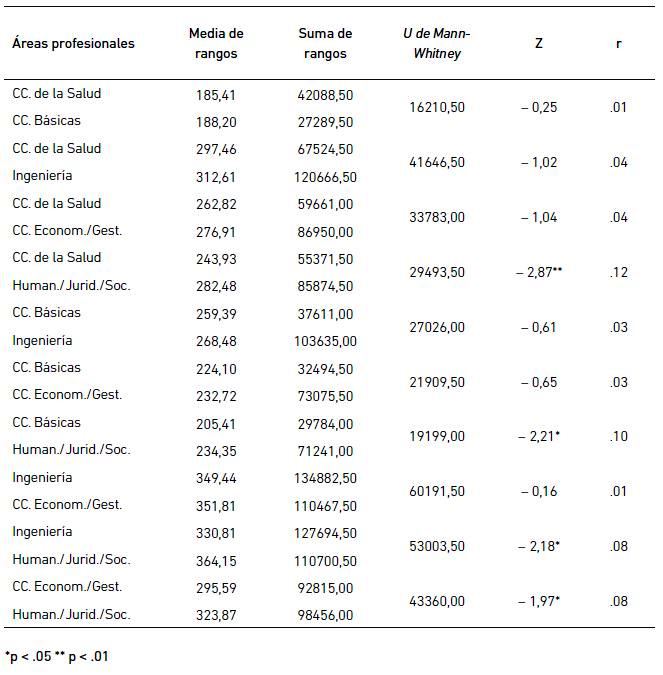 Al haberse encontrado diferencias estadísticamente significativas en el área curiosidad de la disposición hacia el pensamiento crítico entre los participantes considerando las diversas áreas profesionales, de manera complementaria se estudia entre qué áreas se dan estas diferencias. En la tabla 9 se presentan los resultados de la comparación en el área curiosidad de la disposición hacia el pensamiento crítico entre los estudiantes de Ciencias de la Salud y los de Ciencias Básicas. Se observa que no hay una diferencia estadísticamente significativa (U = 16210,50, Z = –0,25, r = .01) entre los estudiantes de estas dos áreas.