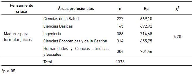 En cuanto a la comparación del área madurez para formular juicios de la disposición hacia el pensamiento crítico entre los participantes considerando las diversas áreas profesionales, los resultados (tabla 10) indican que no se encuentran diferencias estadís- ticas significativas (χ2 = 4,70 p > .05).