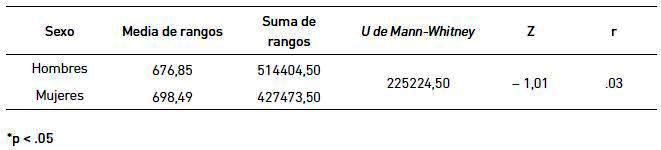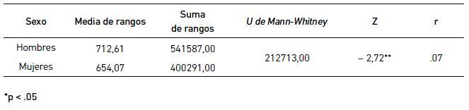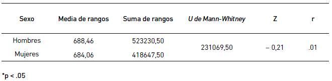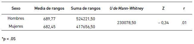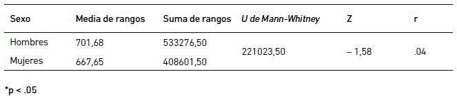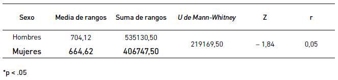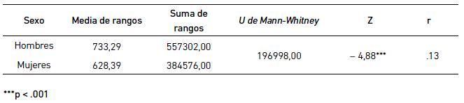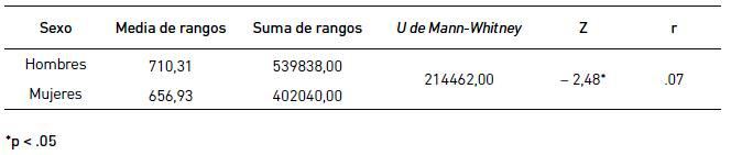 En lo que se refiere a la comparación en el área curiosidad de la disposición hacia el pensamiento crítico entre los participantes hombres y mujeres, los resultados en la tabla 17 muestran que existen diferencias estadísticamente significativas entre ambos grupos (U = 196998,00, Z = – 4,88, por lo que el tamaño del efecto es mediano). Los estudiantes hombres son los que obtienen una media de rangos más alta (733,29).
