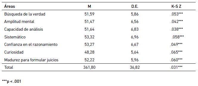 Para poder determinar el estadístico a utilizar en el contraste de hipótesis, se aplicó la Prueba de Bondad de Ajuste de Kolmogorov-Smirnov a los puntajes de la Escala de Disposición hacia el Pensamiento Crítico (Escurra y Delgado, 2008a), tanto al puntaje total como a los correspondientes a sus distintas áreas (Cohen, 1988; Delgado, Escurra y Torres, 2006; Siegel y Castellan, 2012). Los resultados de la tabla 1 muestran valores Z de Kolmogorov-Smirnov estadísticamente significativos tanto en los puntajes de las áreas como en el puntaje total del instrumento (búsqueda de la verdad = .053, p < .001; amplitud mental = .042, p < .001; capacidad de análisis = .038, p < .001; sistemático =.058, p < .001; confianza en el razonamiento = .049, p < .001; curiosidad = .065, p < .001; madurez para formular juicios = .060, p < .001 y total de disposición hacia el pensamiento crítico = .031, p < .001), lo que indica que no se distribuyen acorde a la curva normal. Por lo tanto, se pueden utilizar estadísticos no paramétricos para el contraste de hipótesis, en este caso la Prueba de Kruskal-Wallis y la U de Mann Whitney.