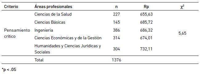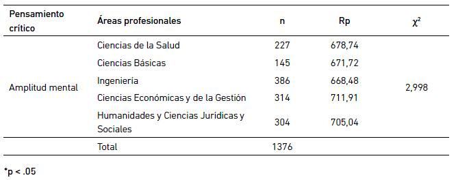 En lo que se refiere a la comparación en el área amplitud mental de la disposición hacia el pensamiento crítico entre los participantes considerando las diversas áreas profesionales, los resultados en la tabla 4 muestran que no existen diferencia significativa (χ2 = 2,998 p > .05.