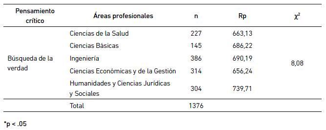 En cuanto a la comparación en el área búsqueda de la verdad de la disposición hacia el pensamiento crítico entre los estudiantes de una universidad estatal de Lima Metropolitana considerando las diversas áreas profesionales (tabla 3), se encontró que no había diferencia estadísticamente significativa, lo cual coincide con lo señalado por Facione et al. (2000) acerca de que la disposición hacia el pensamiento crítico también se refiere a cómo decidir, qué hacer o creer lógicamente. El área de búsqueda de la verdad, según Escurra y Delgado (2008a), se refiere a la motivación de la persona para buscar la verdad y para hacer preguntas, siendo honesto y objetivo con las respuestas que se obtienen aun cuando estas puedan ser contradictorias, lo cual es de esperar en todo estudiante universitario.