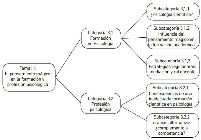 El tercero de los tres temas abordó el núcleo de la investigación: la presencia e implicancia del pensamiento mágico en la profesión psicológica (figura 3). En la primera categoría se identificó que la mayoría de los docentes validó la distinción entre una psicología científica/académica de una psicología popular.