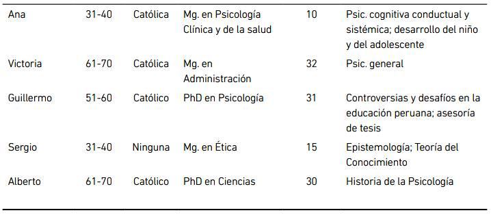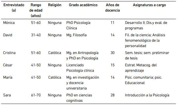 Se seleccionaron docentes de psicología bajo un muestreo intencional, de acuerdo con su interés y disponibilidad en participar sobre el tema, con un criterio no probabilístico y en cadena, lo que culminó al cumplirse el criterio de saturación (Flick, 2015; Hernández, Fernández u Baptista, 2014; Martínez-Salgado, 2011). Los participantes fueron en total once docentes de psicología: seis mujeres y cinco hombres, con edades comprendidas entre 31 y 70 años.